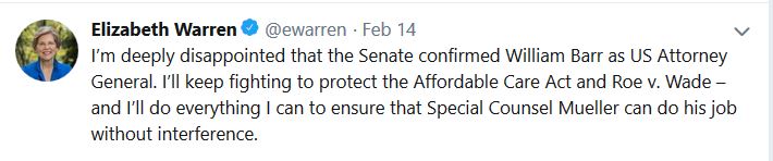 “I’m deeply disappointed that the Senate confirmed William Barr as U.S. Attorney General,” Warren said in a Tweet. “I’ll keep fighting to protect the Affordable Care Act and Roe v. Wade—and I’ll do everything I can to ensure that Special Counsel Mueller can do his job without interference.”