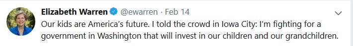 “Our kids are America’s future,” Warren said in another Tweet that day. “I told the crowd in Iowa City: I’m fighting for a government in Washington that will invest n our children and our grandchildren.”