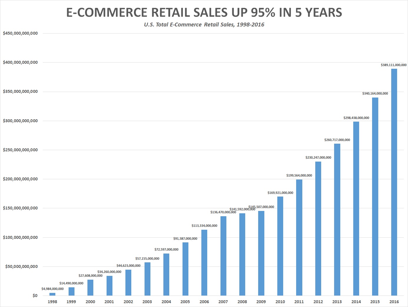 In 2011, total E-commerce retail sales were $199,564,000,000, according to the bureau. By 2016, the latest year on record, they had climbed to $389,111,000,000.